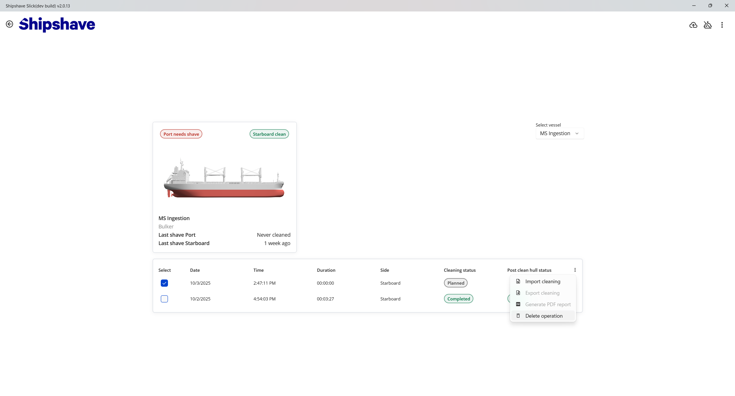 Navigate to the vessel operation page => select the cleaning(s) to delete => click the three dots in the table's top right corner => select "Delete operation".