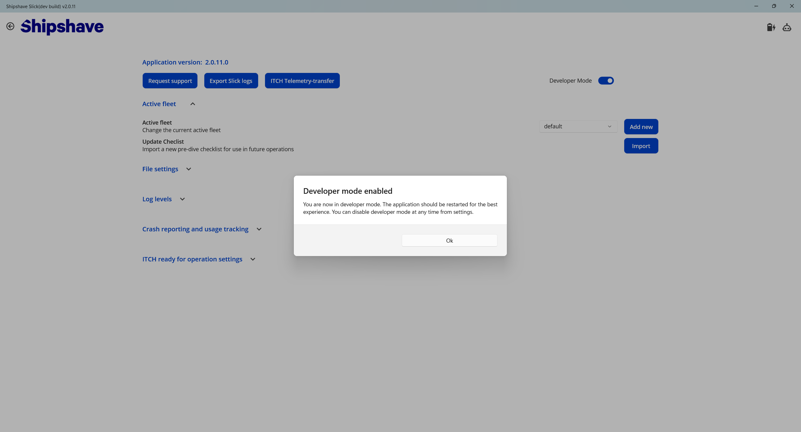 Developer mode allows changing of the current "Fleet" from the Settings page. A Fleet is a group of vessels that is currently used by Slick. Customers will (for now) only have one Fleet called "default". To hide customer vessels during testing or for development, more fleets can be added and the active fleet can be changed.